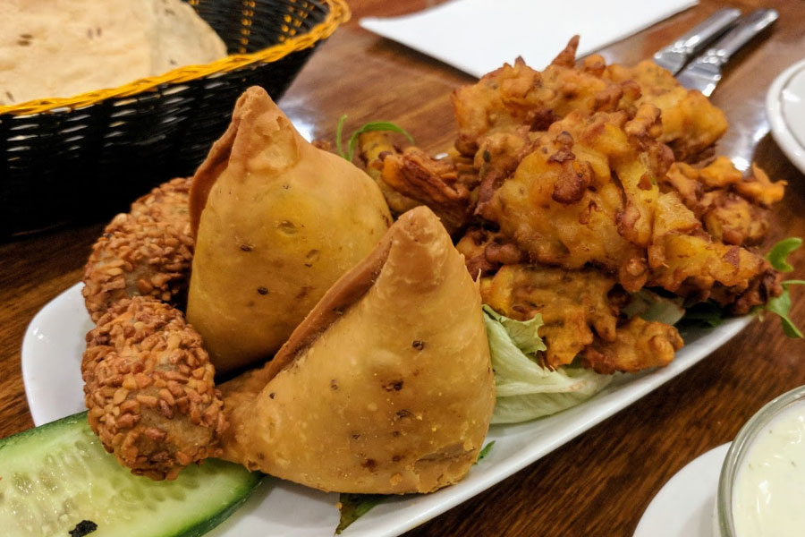 Onion bhaji, Kaju Kebab, Vegetable Samosa.