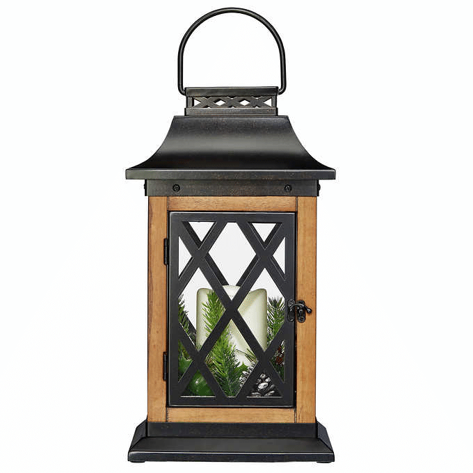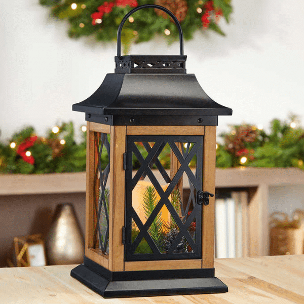 Add a festive glow to your home with this beautiful holiday lantern. The metal lattice elevates the look of the classical lantern, featuring a natural wood frame, metal top and base, and sprigs of holiday greens and berries. The battery-operated LED candle softly illuminates through each tempered glass panel, complete with timer 6-hours on, 18-hours off to light up your holidays on schedule.